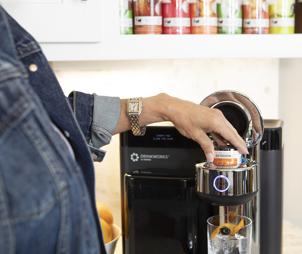 - A drink Pod being inserted into the Drinkworks machine, and the button being pressed. Machine should be set up in/around the house where you would imagine it naturally living (a bar or kitchen area) surrounded by a few pod sleeves and bar accompaniments (fresh fruit, glasses, ice, etc.)